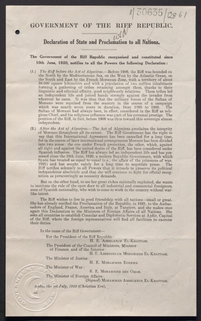 في سنة 1923، قامت جمهورية الريف بخطوة نادرة في ذلك الزمن؛ إذ لم تكتفِ بالمقاومة المسلحة، بل خاطبت العالم عبر القانون الدولي. فمن لندن، تم إرسال وثيقة رسمية بعنوان: “إعلان الدولة وبلاغ إلى جميع الأمم من حكومة جمهورية الريف” إلى حكومات وهيئات دولية، من بينها عصبة الأمم. وقد صدرت هذه الوثيقة باسم حكومة محمد بن عبد الكريم الخطابي، وهي محفوظة اليوم في أرشيف الأمم المتحدة بجنيف، ولم تكن مجرد خطوة رمزية، بل محاولة مدروسة لإدخال الريف في النظام الدولي الناشئ